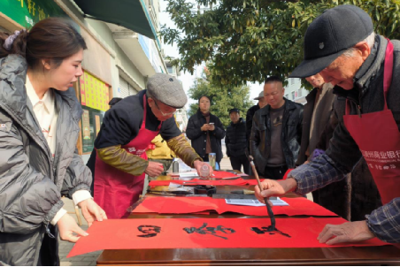 墨韵迎新,春联送“福”,稠州银行丽水庆元支行网点门口笔墨飘香,几位受邀前来的书法家正挥毫泼墨,为客户及周边群众书写新春对联。这些对联既有传统吉祥话,也有时代热门词,承载着对新一年的美好祝愿。