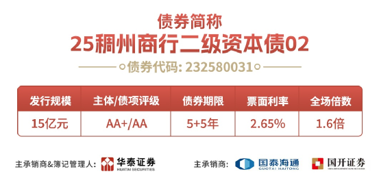 本期债券发行规模15亿元,票面利率2.65%,期限5+5年,全场倍数为1.6倍。目前,稠州银行2025年度二级资本债券已全部发行成功,共计40亿元。