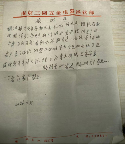 一张微微泛黄、带着岁月摩挲痕迹的手写感谢信,被90岁高龄的姜奶奶亲手交到浙江稠州商业银行(以下简称“稠州银行”)南京莫愁湖支行柜员手中。信纸是印有旧式红格抬头的老式信笺,却衬得手写字迹格外真切。