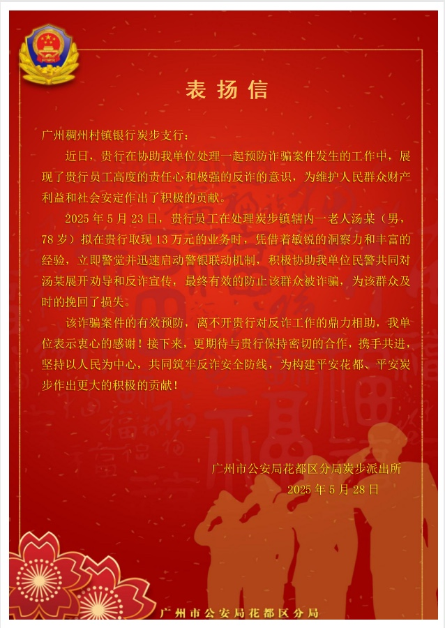 我行始终践行金融为民的服务理念,不断加大金融犯罪的防范与管控,优化风控流程,筑牢反诈“防火墙”。近日,我行炭步支行凭借敏锐的风险洞察力与高效的警银协作机制,成功堵截了一起涉诈取现事件,有效挽回客户经济损失13万元并收到公安机关表扬信。