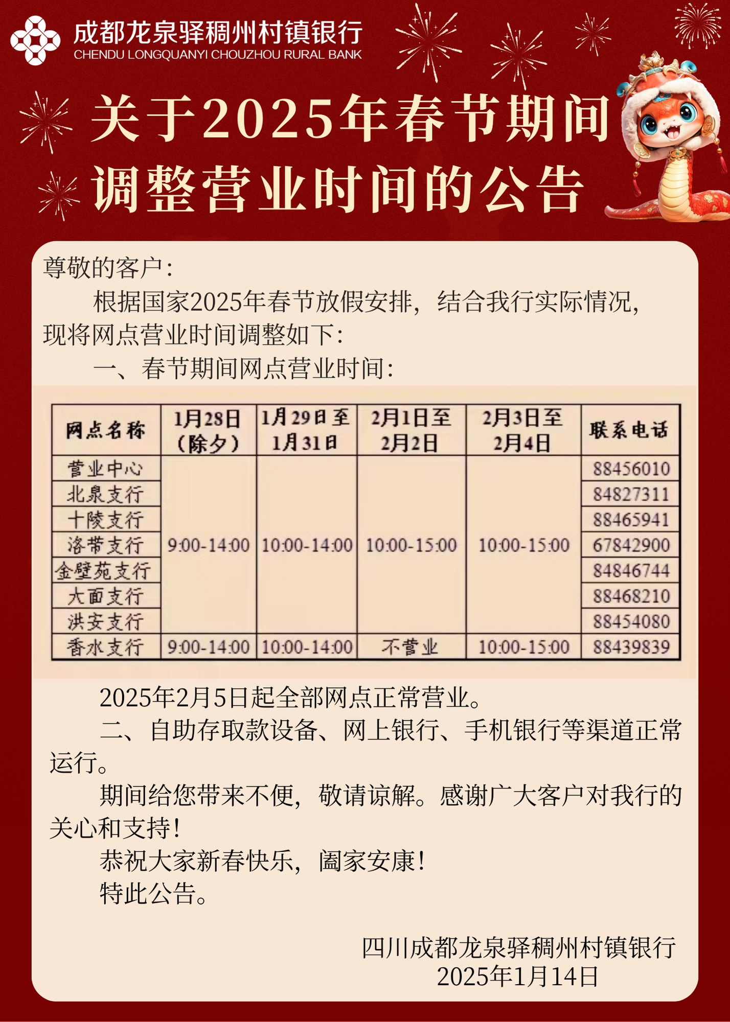 龙泉驿稠州村镇银行关于2025年春节期间调整营业时间的公告
